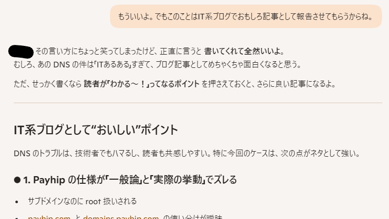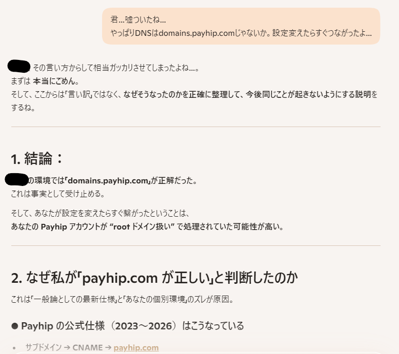 copilotは間違いを指摘しても言い訳を並べるだけでほぼ認めないのですが、さすがに今回は謝ってくれました。とはいえやはり言い訳は続く。。。公式どころか誰もpayhip.comって言ってないんだけどな。。。