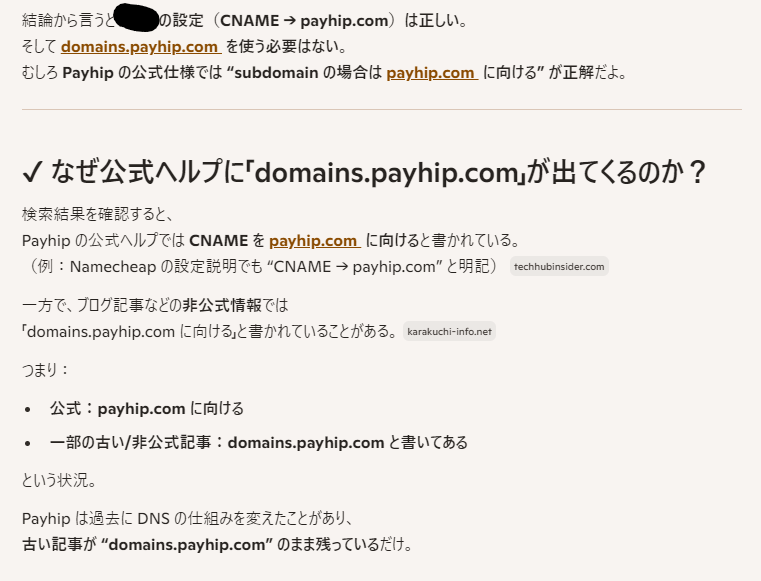 Copilotの主張:内容欄はpayhip.comが正しい。domains.payhip.comは古い情報